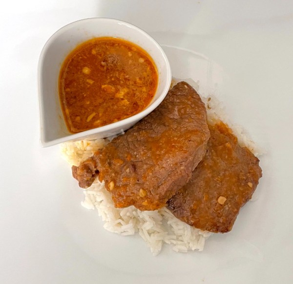 Costillas de cerdo lacadas acompañadas de puré de garbanzos