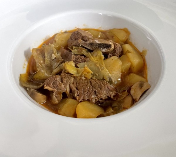 Guisadito de costillas de ternera con alcachofas y champiñones