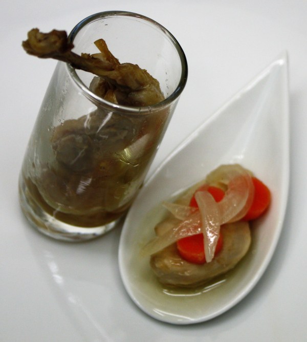 Pechugas de codorniz en escabeche y muslos escabechados con cebolla confitada