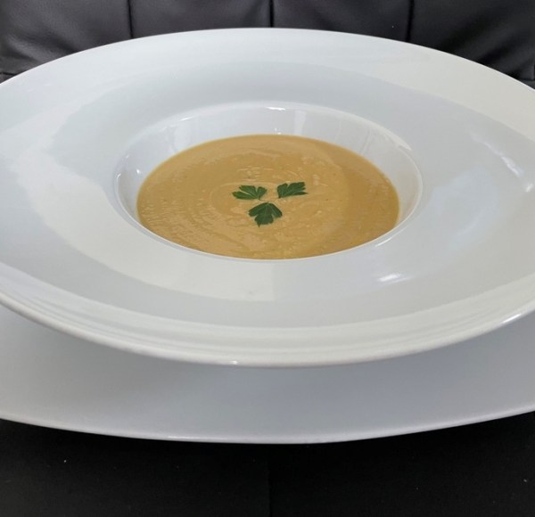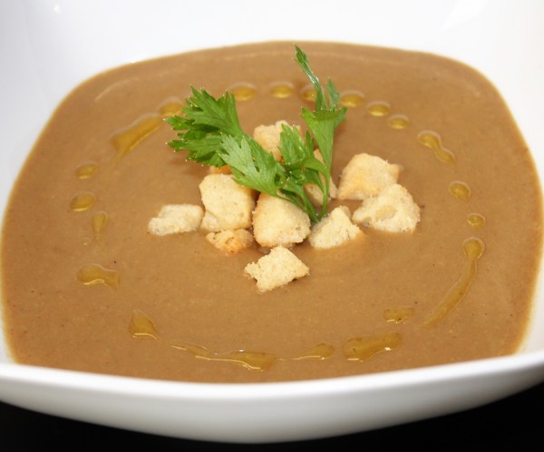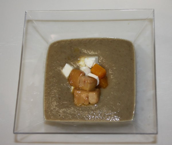 Crema de lentejas con dados de calabaza, queso de cabra y foie