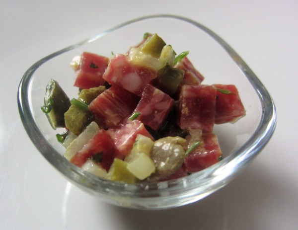 Vamos a hacer un tartar de salchichón en pequeñas raciones, para un picoteo. INGREDIENTES 10 MINIRACIONES: 130 g de salchichón 10 pepinillos en vinagre 30 alcaparras Media cebolla tierna 3 ramas de perejil Media cucharadita de sal 4 cucharadas de aceite de oliva virgen extra 1 cucharada de mostaza de Dijon Cortar el salchichón en... Leer más →