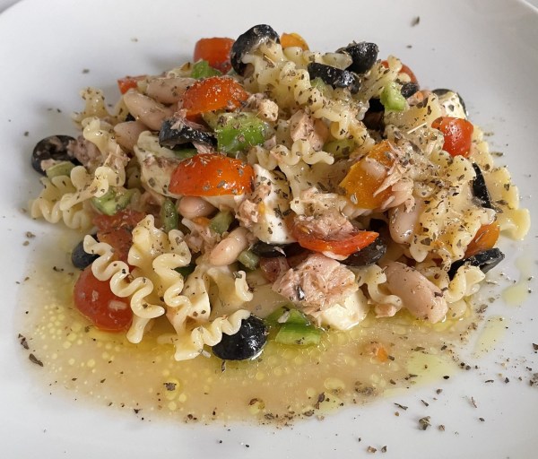 Ensalada de pasta, pollo, queso, aceitunas y huevo frito