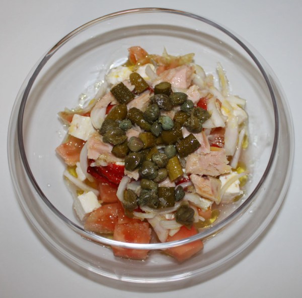 INGREDIENTES 1P: 1 tomate rosa pequeño ( o cualquiera de ensalada ) 1 cebolleta pequeña 1 cucharada de pimiento rojo asado a tiras Un trozo de queso fresco 1 cucharada de alcaparras 1 lomo de atún en aceite 6 pepinillos en vinagre pequeños 1 cucharadita de vinagre de vino tinto ( opcional para los que... Leer más →