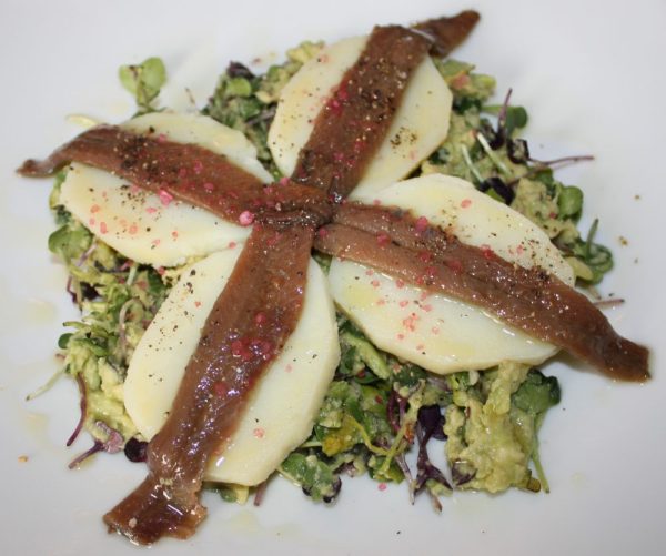 Ensalada de brotes, aguacate, patata y anchoas