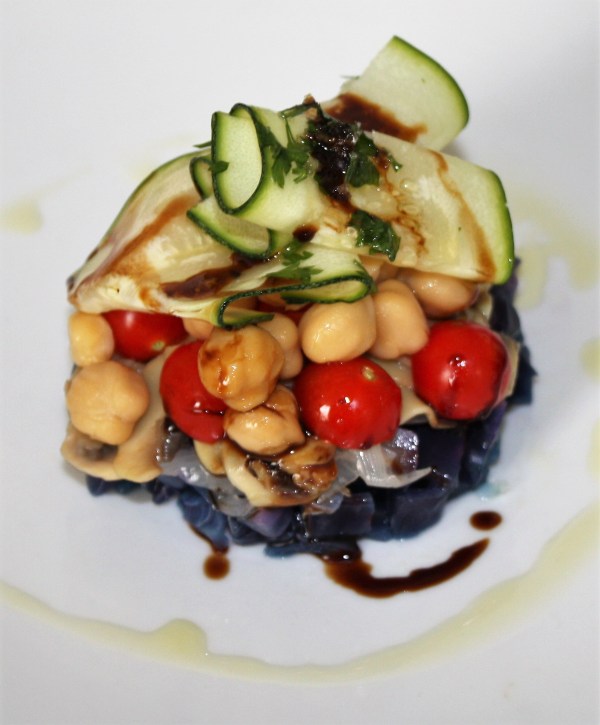 INGREDIENTES 2P: 100 g de garbanzos cocidos de bote 1 cortada de col lombarda de medio cemtímetro ( la morada ) 14 tomates cherry o 2 tomates en rama 2 cortadas de berenjena, finitas 1/3 de calabacín Media cebolleta 3 champiñones 1 rama de perejil 2 cucharadas de aceite de oliva virgen extra 4 cucharadas... Leer más →