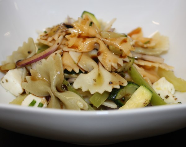 Ensalada de lazos de colores, verduras y mozzarella