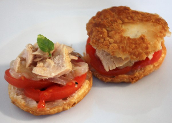 Hojaldre con tomate fresco, atún en aceite, cebolla confitada y albahaca