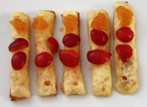 Hojaldre con queso Emmental, mermelada de mandarina y cerezas