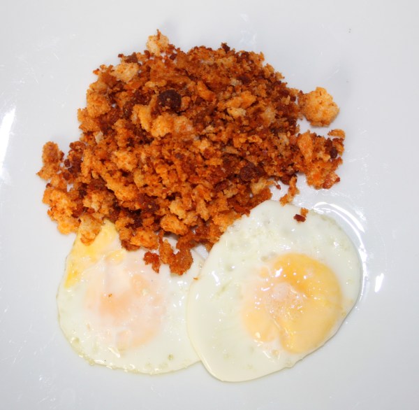 Huevos fritos o escalfados con migas crujientes de embutido