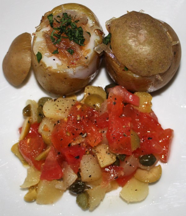 Patatas al horno rellenas de huevo, cebolla y chalota caramelizadas acompañadas de una ensalada de patata, tomate y encurtidos