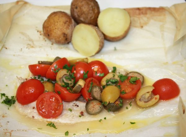 Lenguado en papillote con aceitunas, tomates cherry y alcaparrones