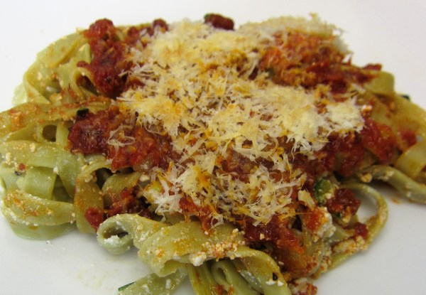 Tagliatelle con calabacín, ricota y salsa de tomate