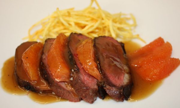 Magret de pato con salsa de Pedro Ximenez y cítricos