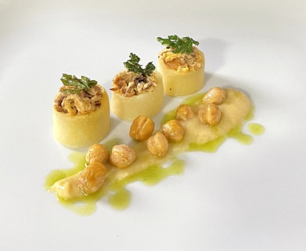 Cilindros de patata con ropa vieja, crema de garbanzos y aceite de cebollino