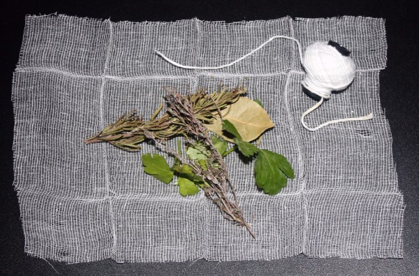 Gasa estéril de farmacia en la que ponemos 2 hojas de laurel, romero, tomillo y perejil. Cerramos y atamos con hilo bramante, el que se utiliza para atar la carne. Si no tenéis podéis utilizar hilo de ganchillo. Las hierbas aromáticas pueden variar según la receta. Esto se hace para que las hierbas dejen su... Leer más →