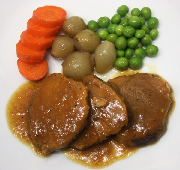 Gallón ( redondo de ternera) acompañado de cebollitas francesas, zanahoria y guisantes