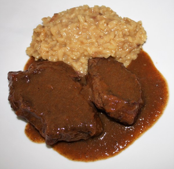 Ossobuco al vino tinto acompañado de risotto a la milanesa