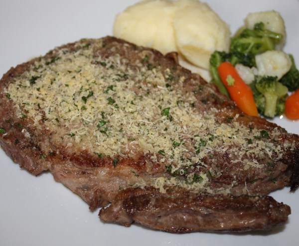 Entrecot gratinado con queso y acompañado de puré de patata casero y verduras al vapor