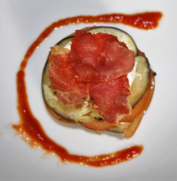 Milhojas de berenjena, tomate, queso de cabra y crujiente de jamón