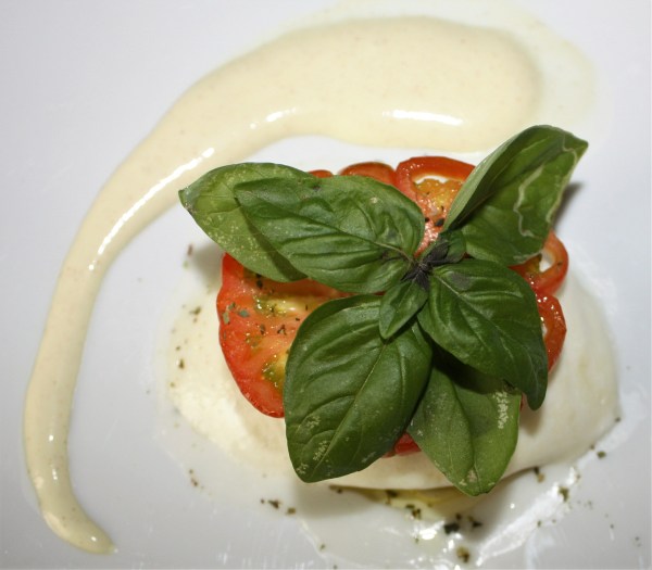 Milhojas de patata, espinacas, mozzarella y tomate, aderezado con yogur griego y mostaza de Dijon