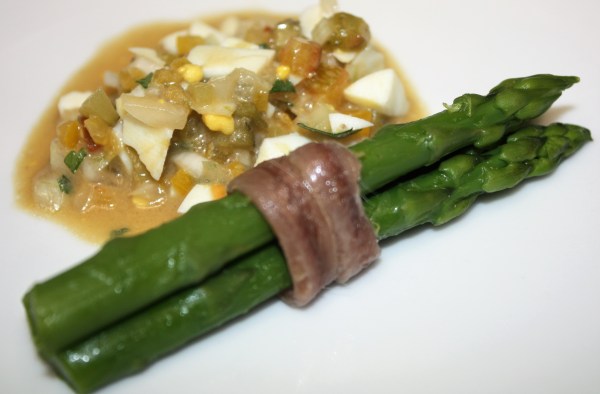 INGREDIENTES 3P: 9 espárragos trigueros Media cebolleta 20 g de pimiento rojo, una rodaja de medio cm 20 g de pimiento amarillo 1 huevo 4 pepinillos en vinagre 30 g de anchoas en aceite ( 1 lata pequeña ) Perejil 2 cucharadas de aceite virgen extra 1 cucharada de vinagre de Jerez Sal Azucar Pimienta... Leer más →
