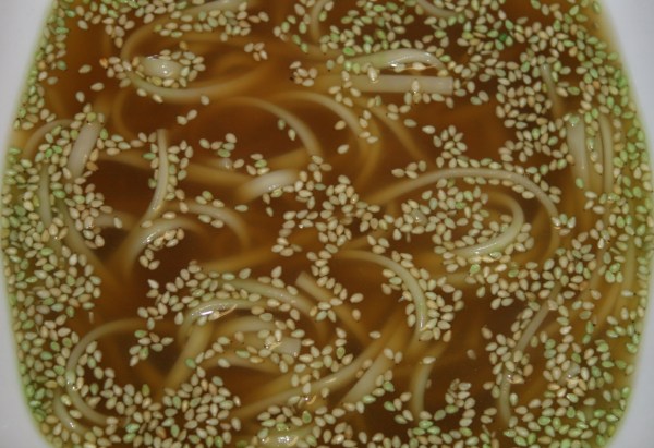 Sopa de soja con fideos gruesos Udon y semillas de sésamo al wasabi